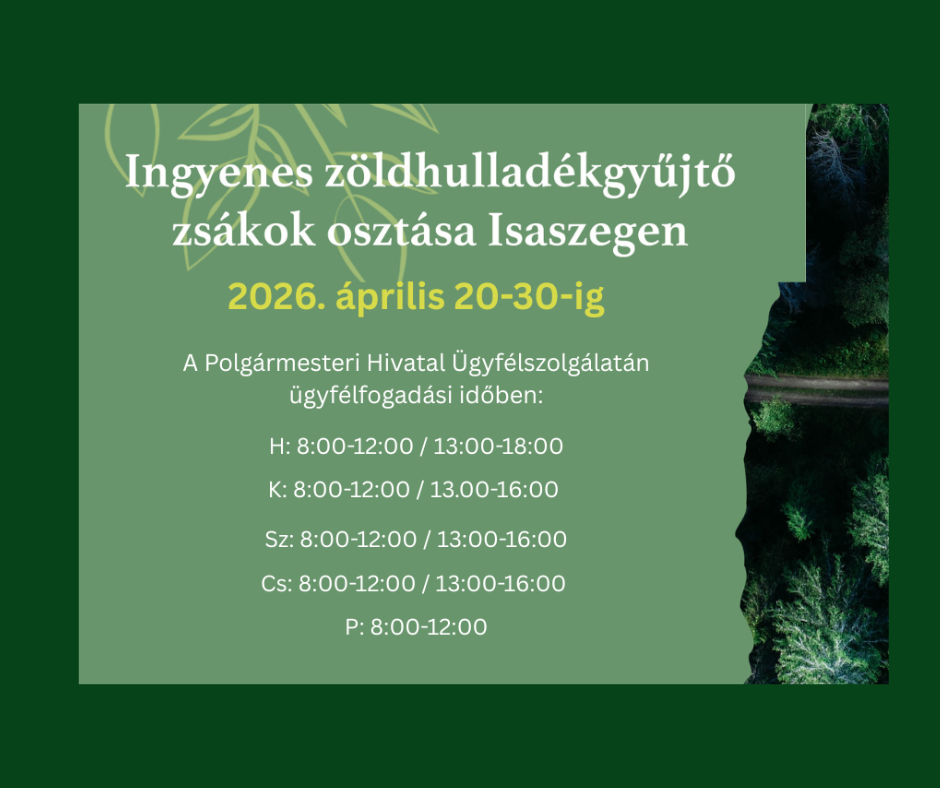 A MOHU Budapest tájékoztatása alapján Isaszeg a régióban azon települések egyike, ahol a lakosság ingyenesen kaphat zöldhulladékgyűjtő zsákot. Ennek mennyisége 10 db/cím/félév. Jelenleg az első félévre vonatkozó mennyiséget kaptuk meg, a második félévről tájékoztatást még nem kaptunk.